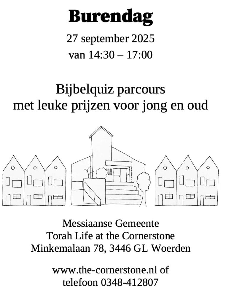 | za. 27/9 | 11:00u, deuren open 10:30u | Shabbat bijeenkomst. Torah Class for Children / Torah Klas voor Kinderen tijdens het onderwijs. | Ki Tetse, Torah: Deuteronomium 21:10-25:9, Haftarah: Jesajah 54:1-10, B'rit Chadashah: 1 Korinthe 5:1-5 |